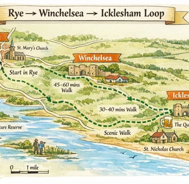 Step 1: Rye → Winchelsea (~2–3 miles / 45–60 min walk, or 5–7 min drive) or 15 by bike