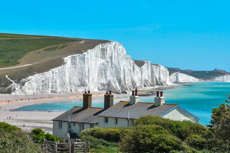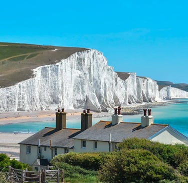 About 30 miles from Rye are the Seven Sisters, a spectacular stretch of chalk cliffs on the Sussex coast in South East England, between Seaford and Eastbourne. It’s one of the most iconic coastal landscapes in the UK, often used in films and postcards because it looks so beautifully “English seaside”—dramatic white cliffs dropping into turquoise-blue sea, rolling green hills on top, and wide, open skies.