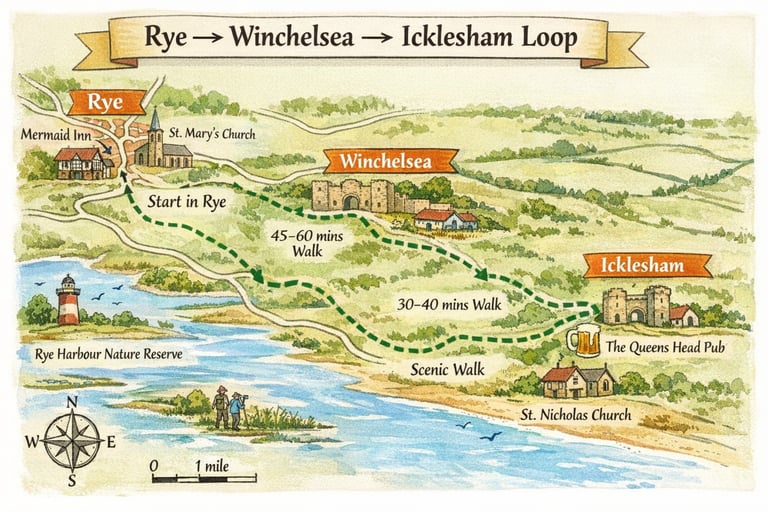 Step 1: Rye → Winchelsea (~2–3 miles / 45–60 min walk, or 5–7 min drive) or 15 by bike